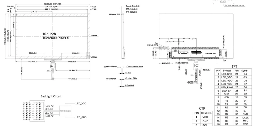 Le sue dimensioni sottili di soli 235 mm × 143 mm × 7,05 mm lo rendono adatto a dispositivi compatti. Alimentato a 3,3 V e utilizzando un cavo FFC a 40 pin (FFC a 6 pin per CTP), il modulo touch screen PCAP industriale da 10,1 pollici funziona a temperature che vanno da -20 °C a 70 °C e ha un intervallo di temperatura di conservazione da -30 °C a 80 °C, garantendo un funzionamento affidabile anche in ambienti difficili.